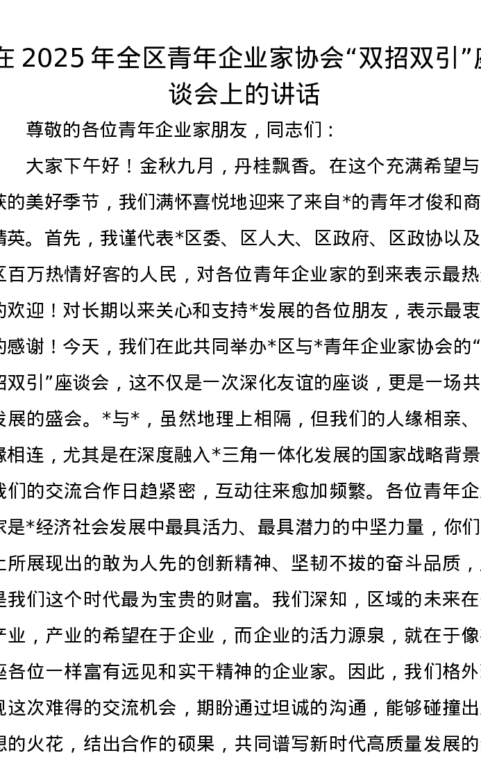 在2025年全区青年企业家协会“双招双引”座谈会上的讲话