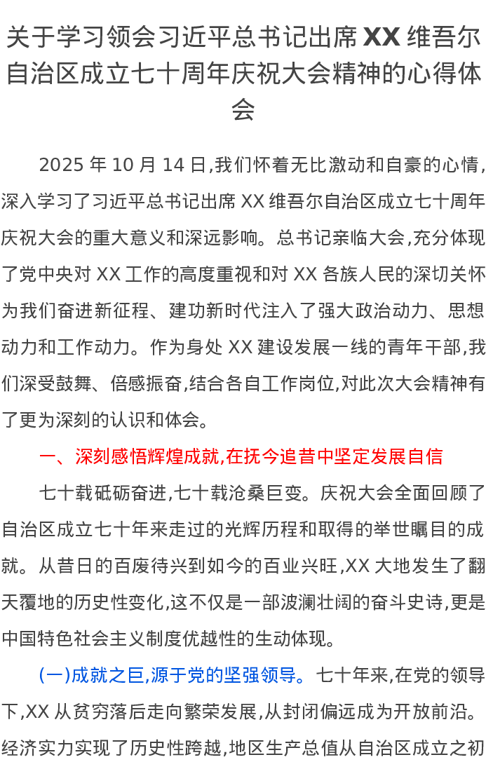 关于学习领会习近平总书记出席XX维吾尔自治区成立七十周年庆祝大会精神的心得体会