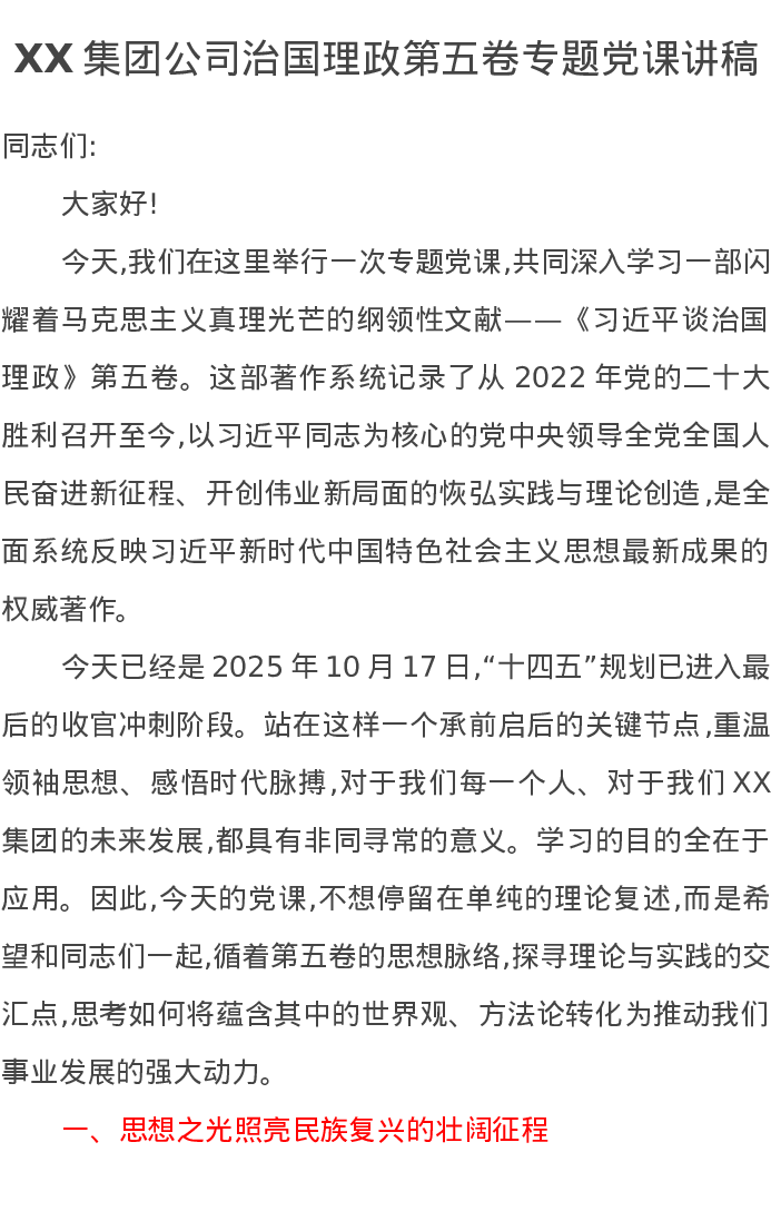 XX集团公司治国理政第五卷专题党课讲稿