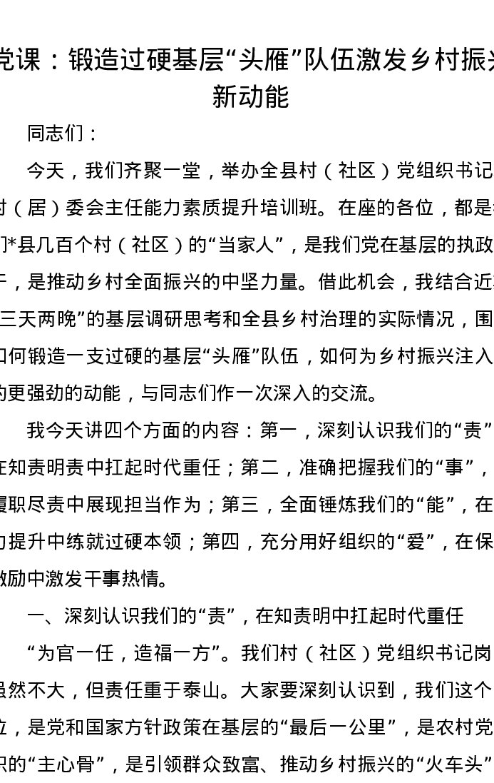 党课讲稿:锻造过硬基层“头雁”队伍激发乡村振兴新动能