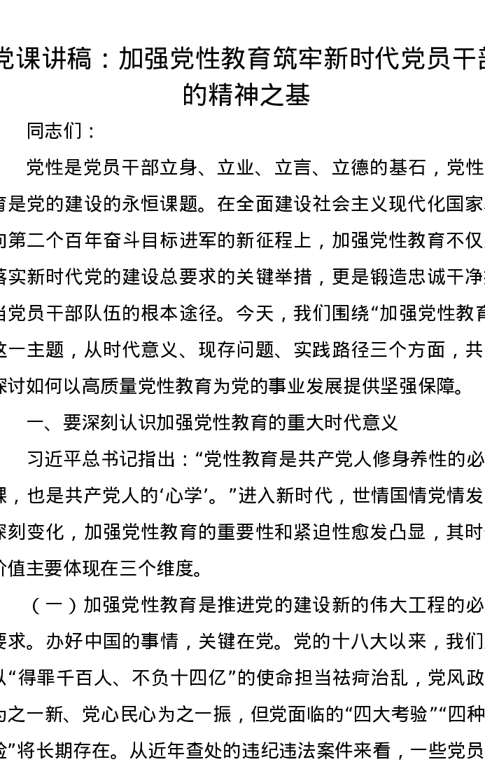 党课讲稿:加强党性教育 筑牢新时代党员干部的精神之基
