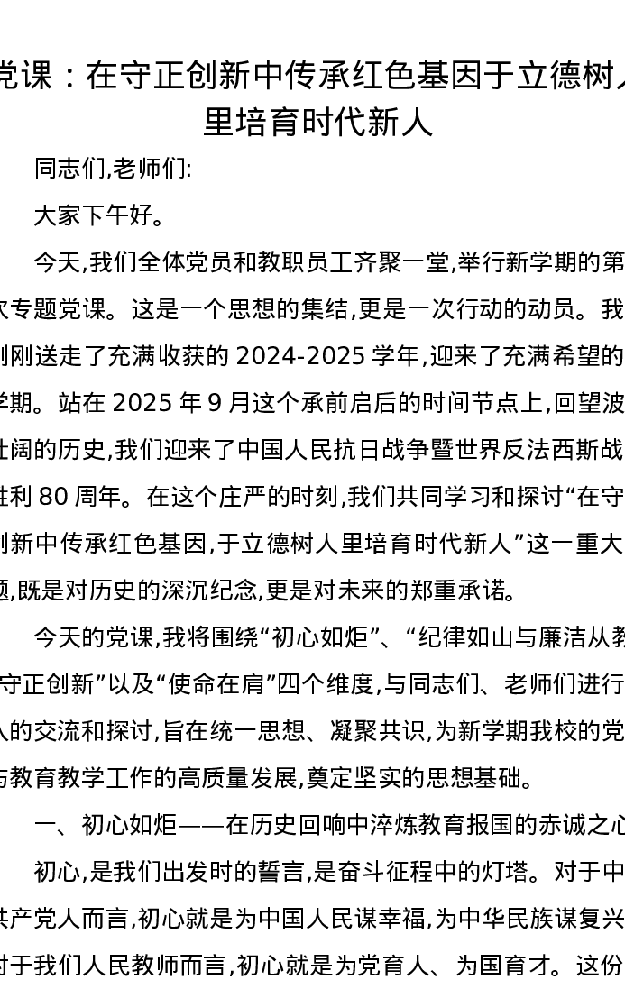 党课讲稿:在守正创新中传承红色基因于立德树人里培育时代新人