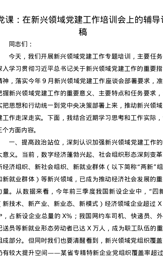 党课讲稿:在新兴领域党建工作培训会上的辅导讲稿