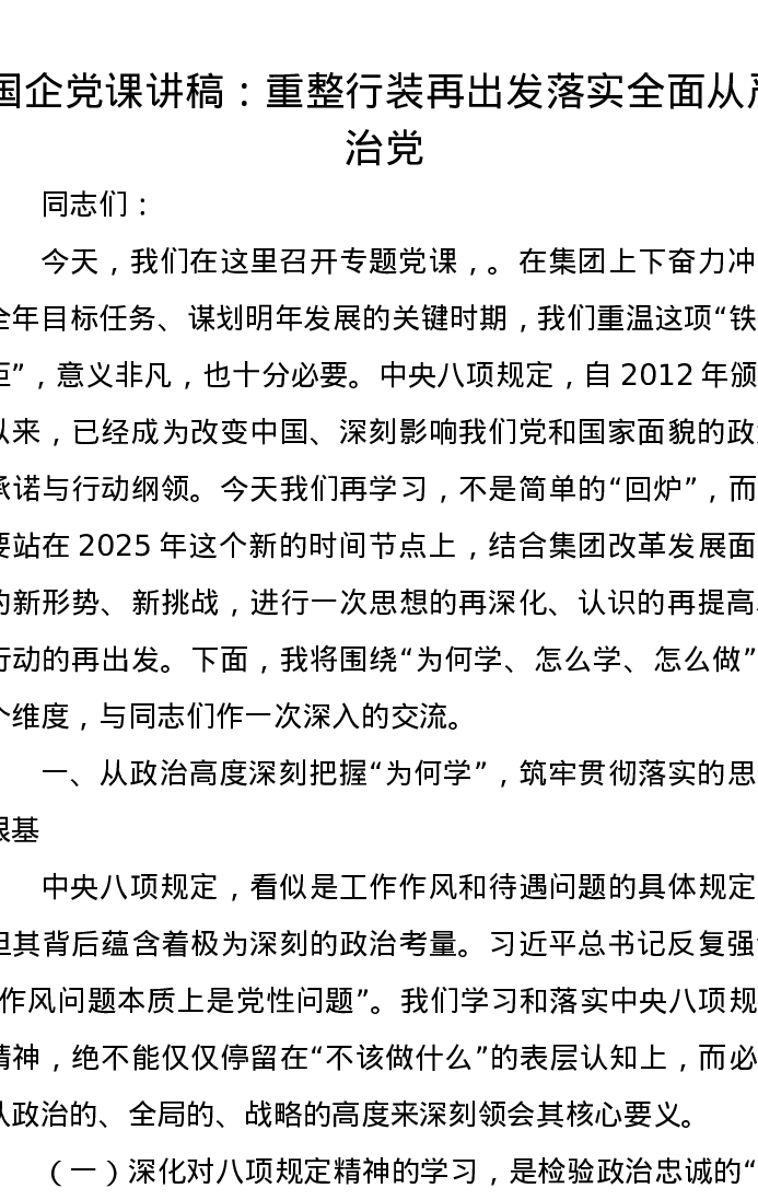 国企党课讲稿:重整行装再出发 落实全面从严治党