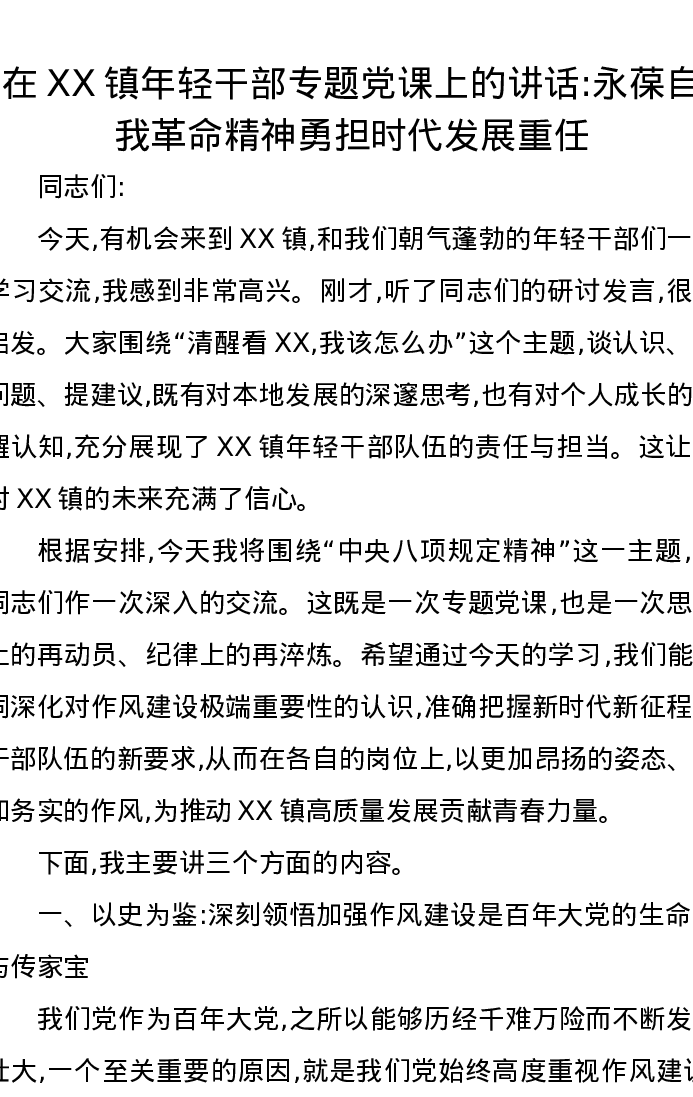 在XX镇年轻干部专题党课上的讲话永葆自我革命精神勇担时代发展重任