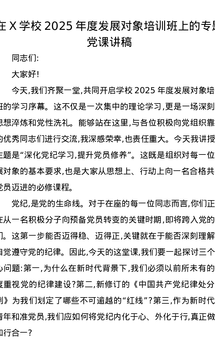在X学校2025年度发展对象培训班上的专题党课讲稿
