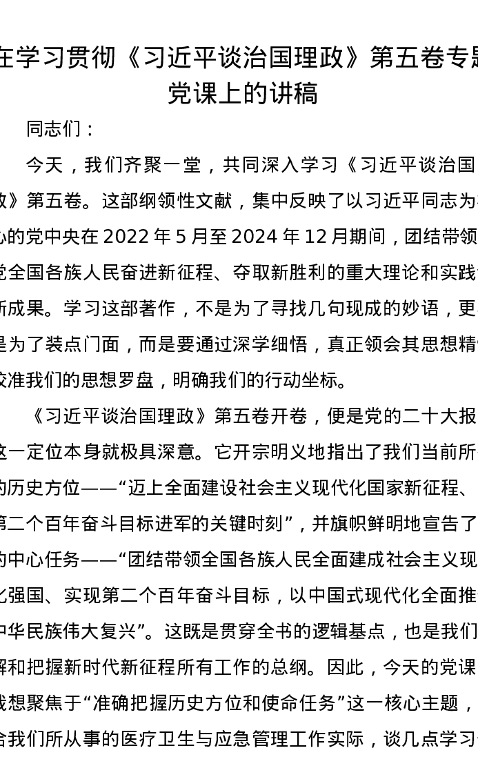 在学习贯彻《习近平谈治国理政》第五卷专题党课上的讲稿