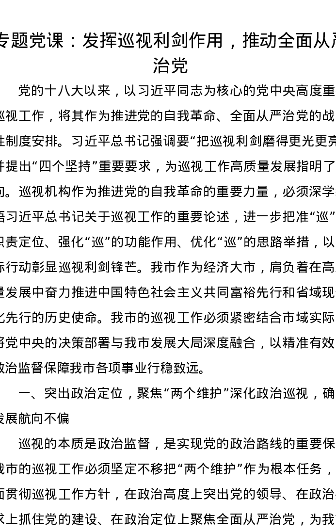 专题党课讲稿:发挥巡视利剑作用,推动全面从严治党