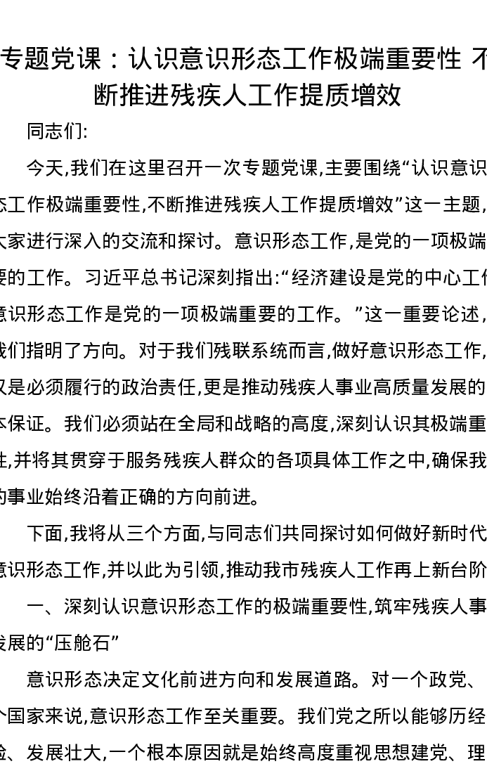 专题党课讲稿:认识意识形态工作极端重要性 不断推进残疾人工作提质增效