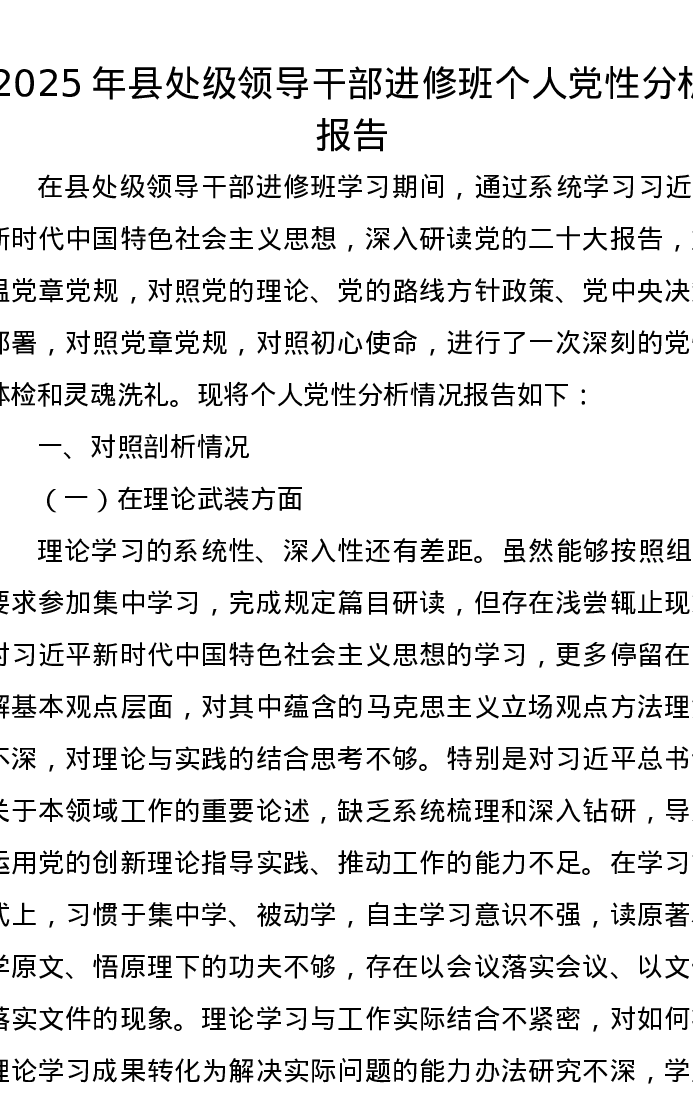 2025年县处级领导干部进修班个人党性分析报告