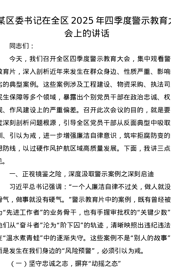 某区委书记在全区2025年四季度警示教育大会上的讲话