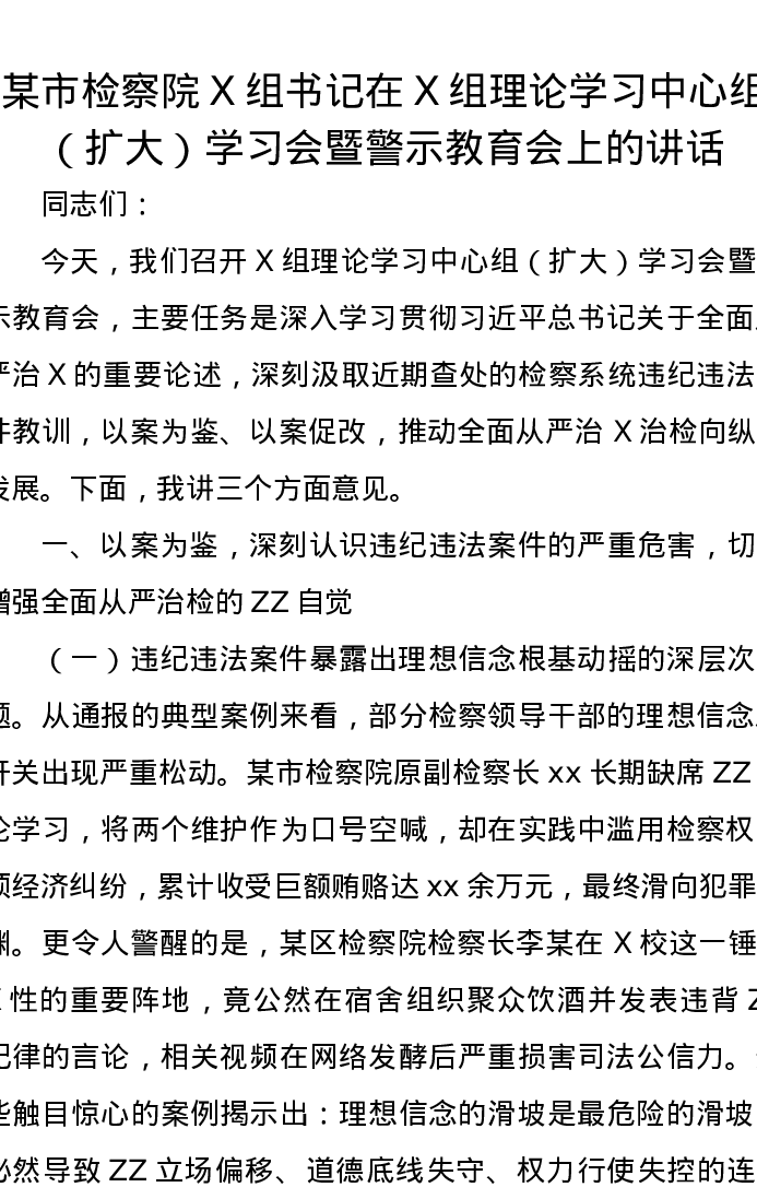 某市检察院党组书记在党组理论学习中心组(扩大)学习会暨警示教育会上的讲话