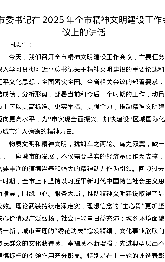 市委书记在2025年全市精神文明建设工作会议上的讲话