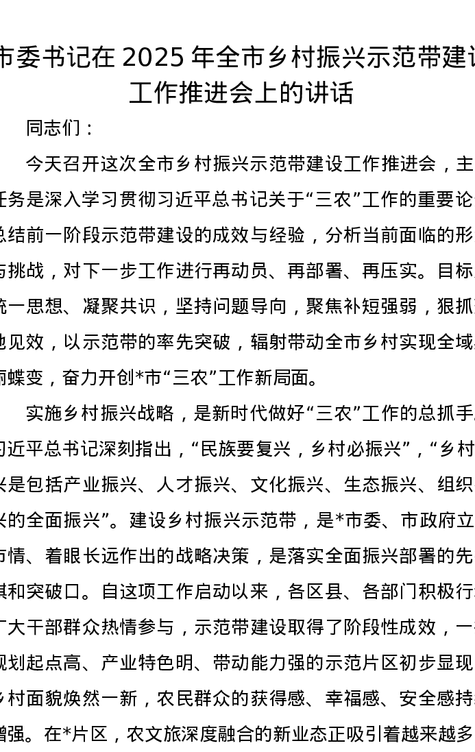 市委书记在2025年全市乡村振兴示范带建设工作推进会上的讲话
