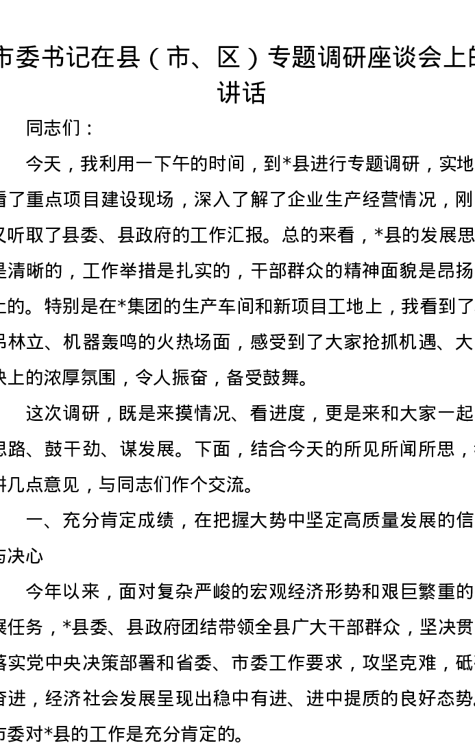 市委书记在县(市、区)专题调研座谈会上的讲话