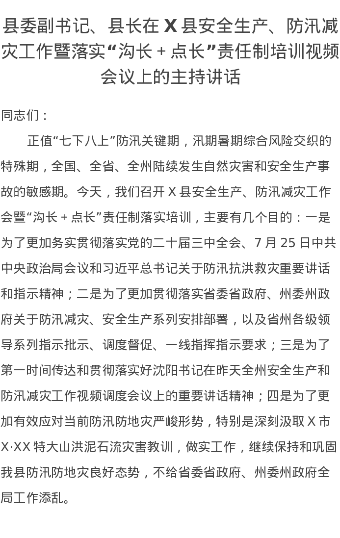 县委副书记、县长在X县安全生产、防汛减灾工作暨落实“沟长+点长”责任制培训视频会议上的主持讲话
