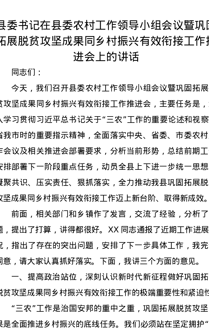 县委书记在县委农村工作领导小组会议暨巩固拓展脱贫攻坚成果同乡村振兴有效衔接工作推进会上的讲话