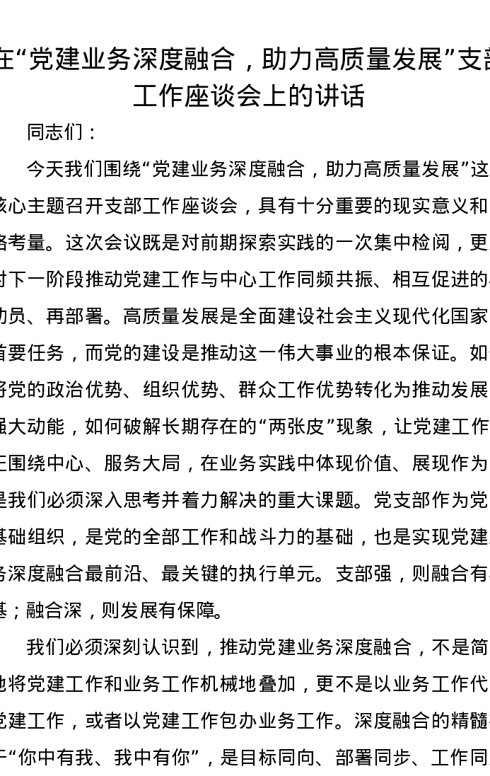 在“党建业务深度融合,助力高质量发展”支部工作座谈会上的讲话