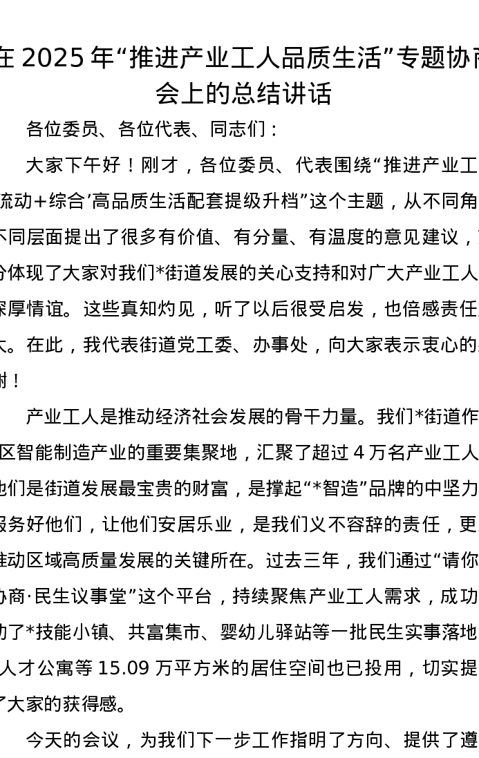 在2025年“推进产业工人品质生活”专题协商会上的总结讲话