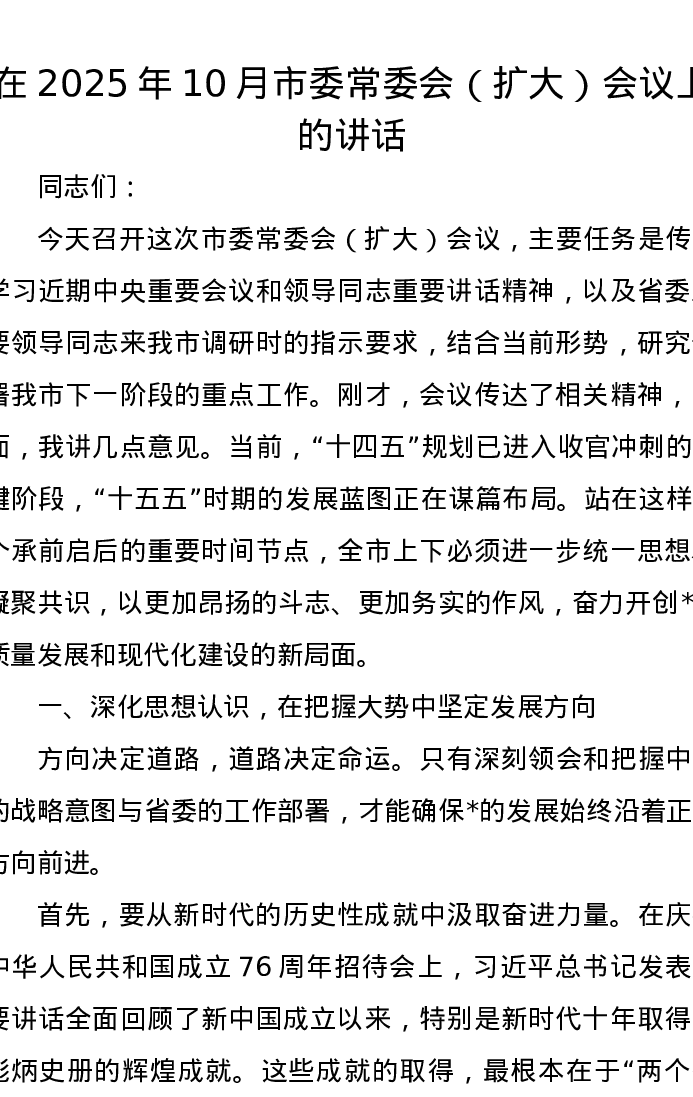 在2025年10月市委常委会(扩大)会议上的讲话