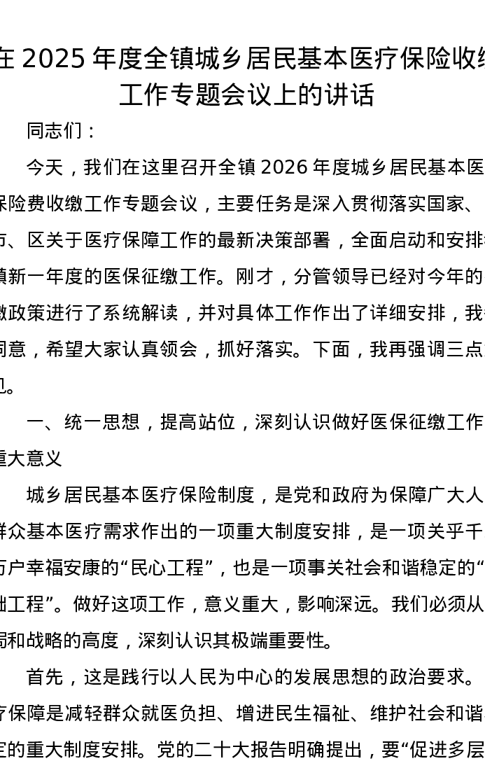 在2025年度全镇城乡居民基本医疗保险收缴工作专题会议上的讲话