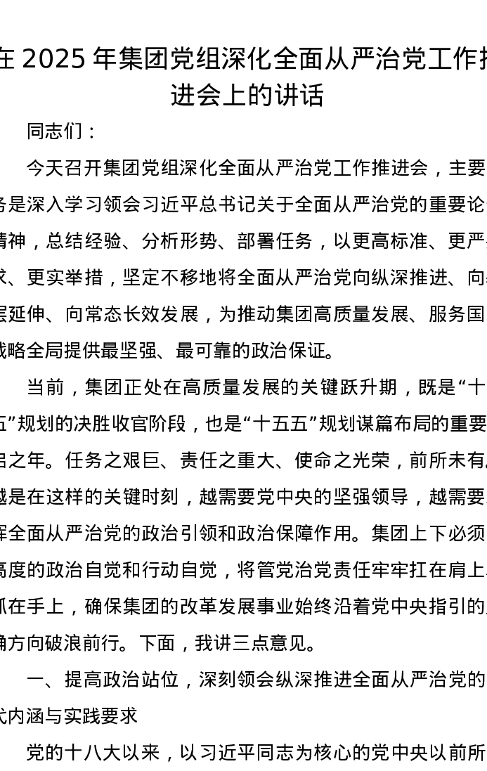 在2025年集团党组深化全面从严治党工作推进会上的讲话