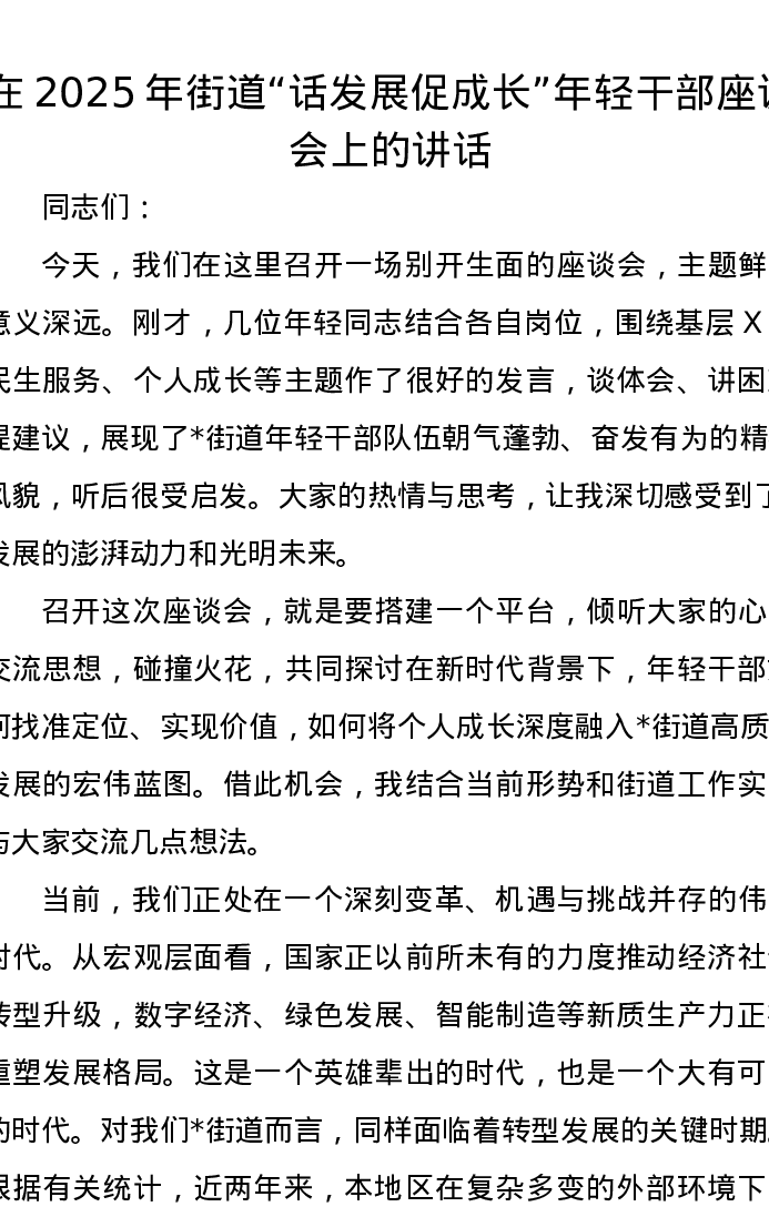 在2025年街道“话发展促成长”年轻干部座谈会上的讲话