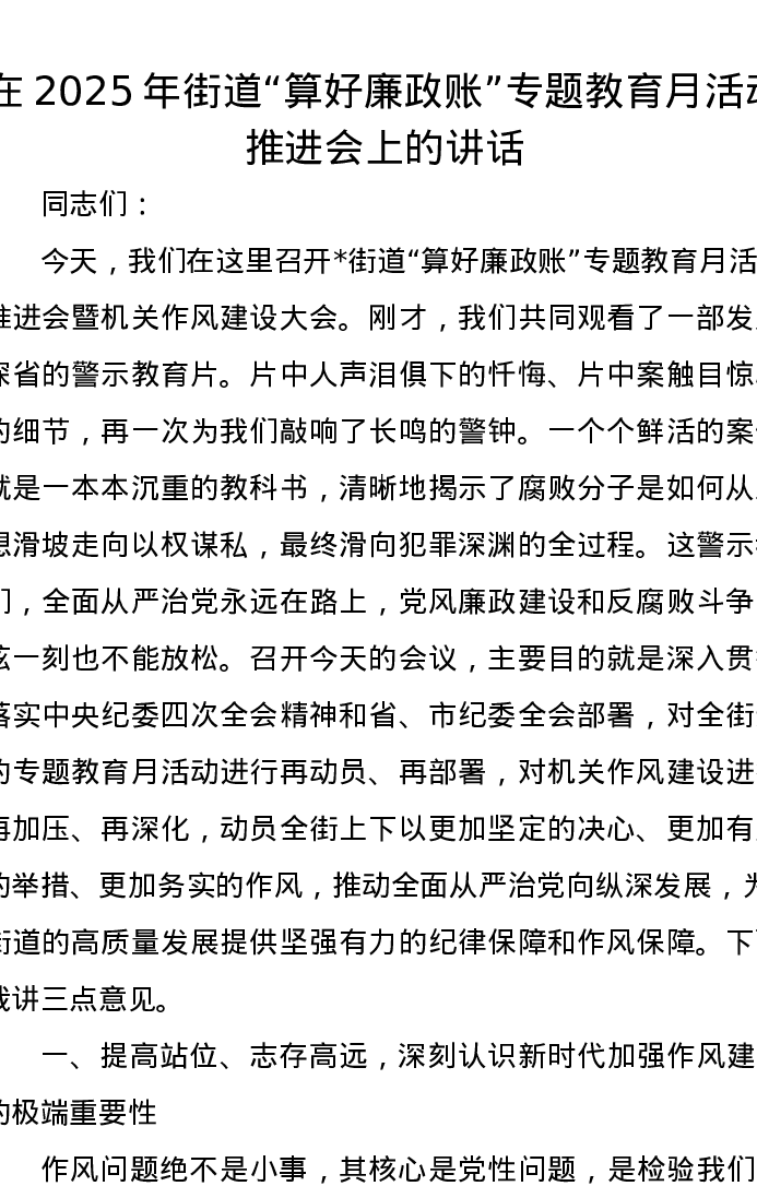 在2025年街道“算好廉政账”专题教育月活动推进会上的讲话