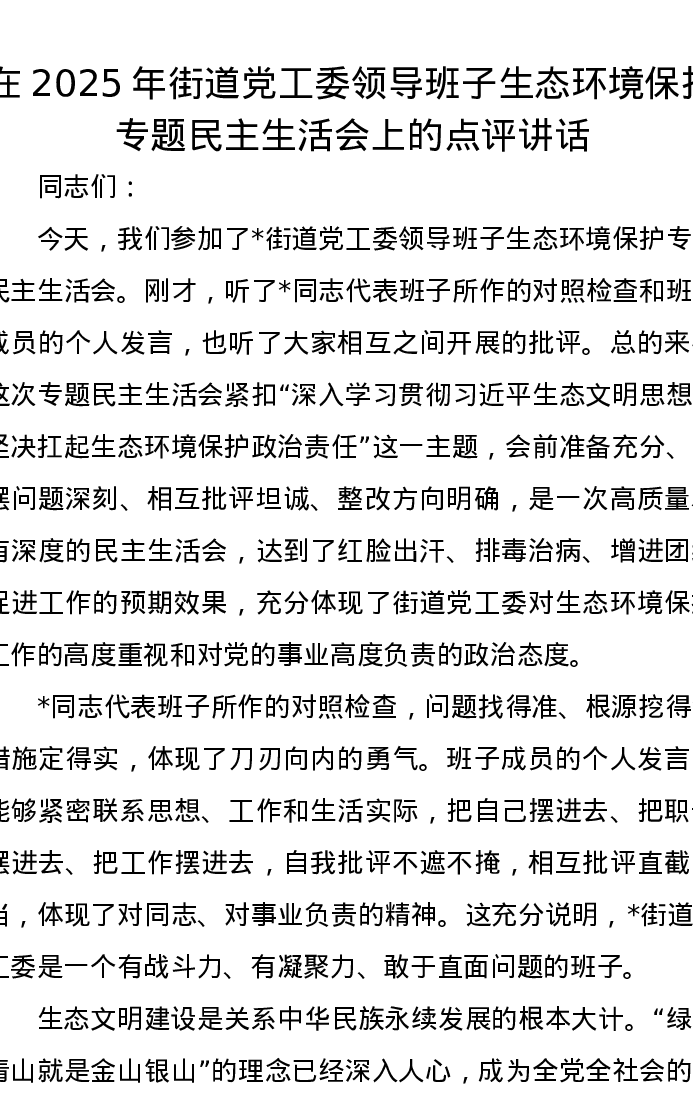 在2025年街道党工委领导班子生态环境保护专题民主生活会上的点评讲话