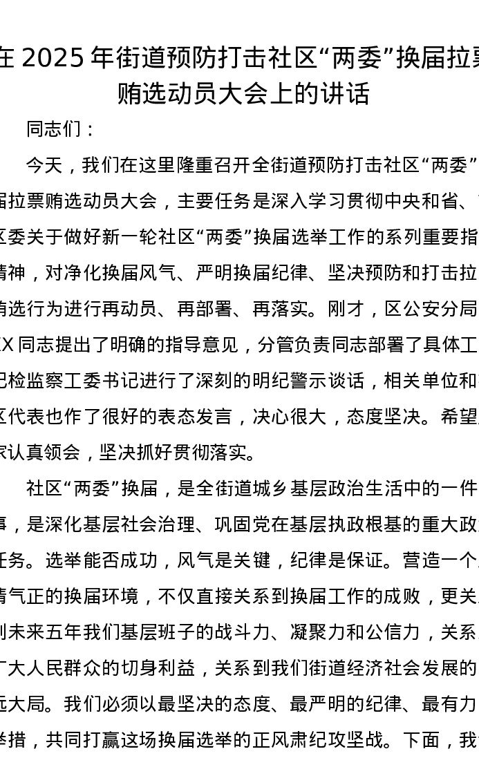 在2025年街道预防打击社区“两委”换届拉票贿选动员大会上的讲话