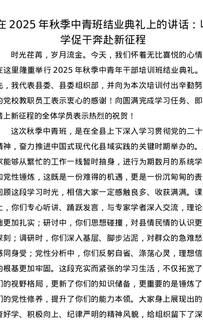 在2025年秋季中青班结业典礼上的讲话:以学促干 奔赴新征程