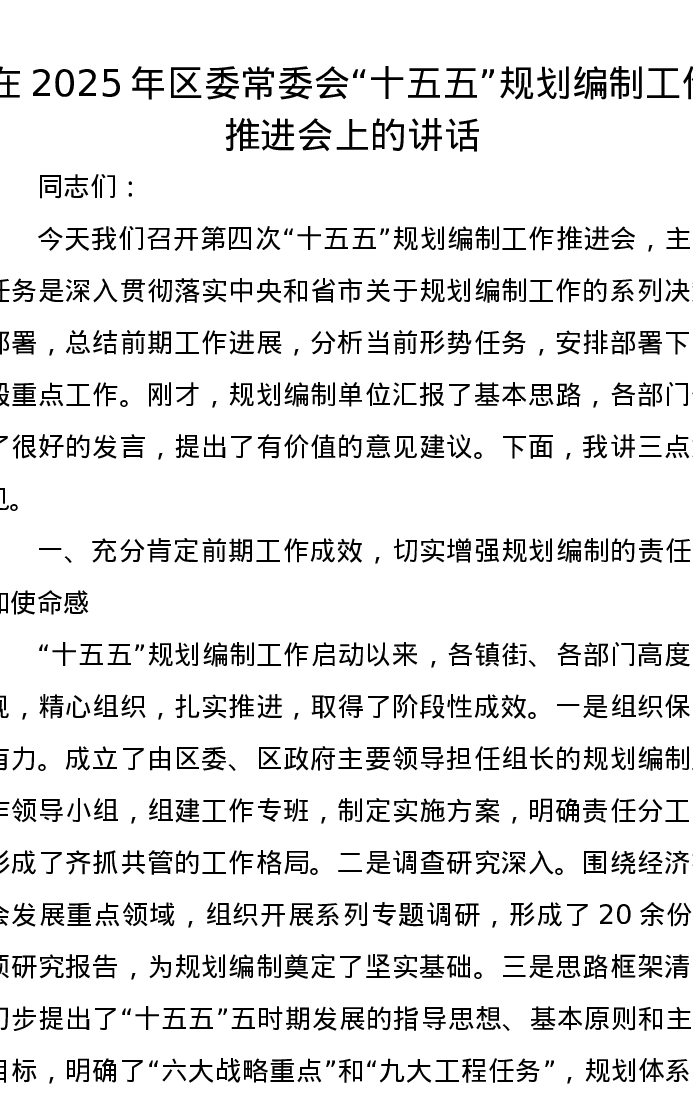 在2025年区委常委会“十五五”规划编制工作推进会上的讲话