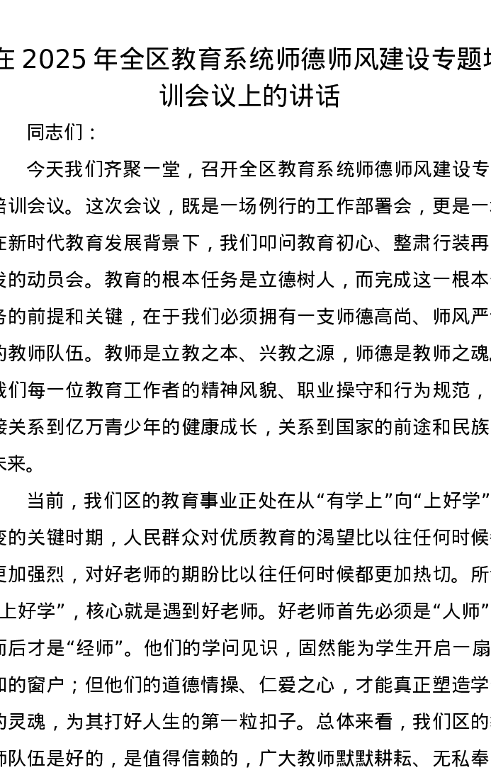 在2025年全区教育系统师德师风建设专题培训会议上的讲话
