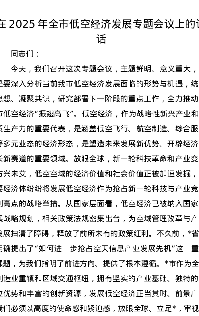 在2025年全市低空经济发展专题会议上的讲话