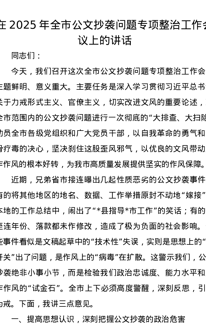 在2025年全市公文抄袭问题专项整治工作会议上的讲话