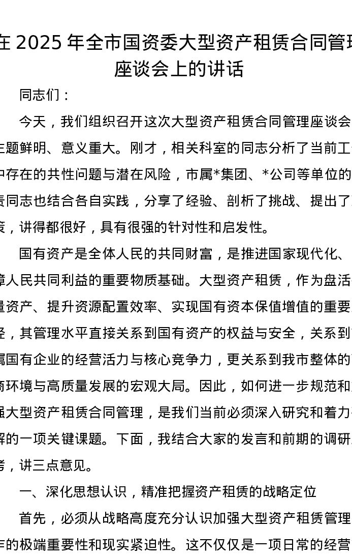 在2025年全市国资委大型资产租赁合同管理座谈会上的讲话