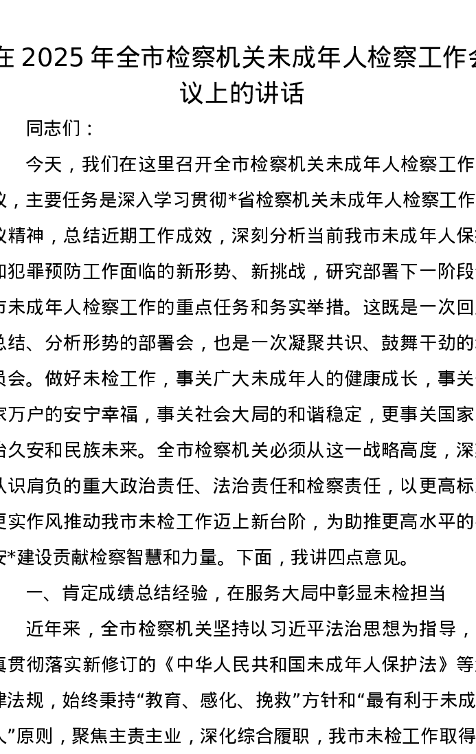 在2025年全市检察机关未成年人检察工作会议上的讲话