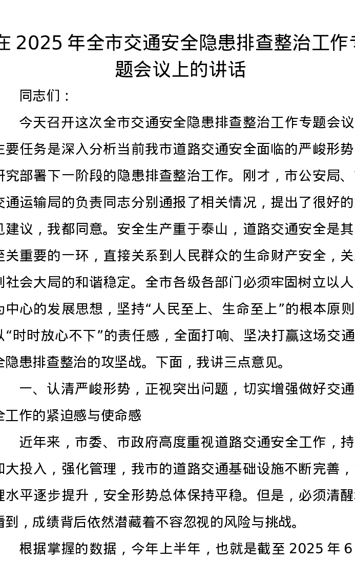 在2025年全市交通安全隐患排查整治工作专题会议上的讲话