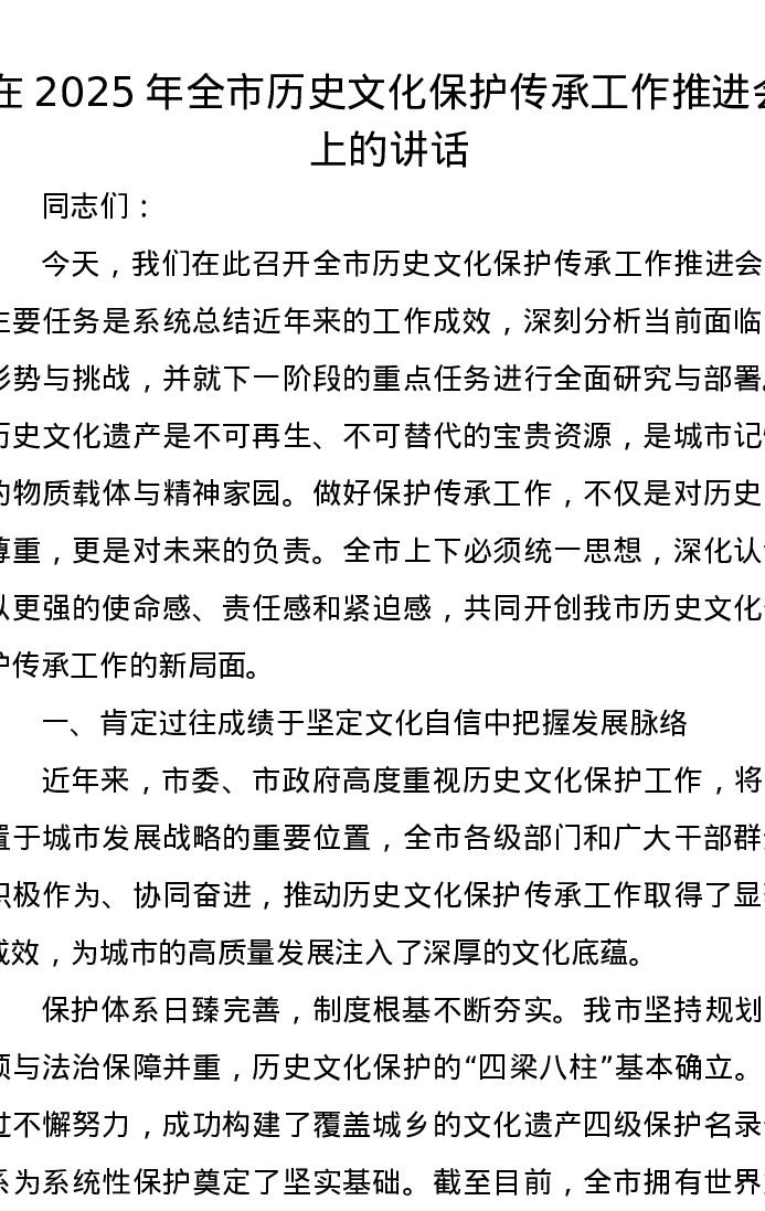 在2025年全市历史文化保护传承工作推进会上的讲话