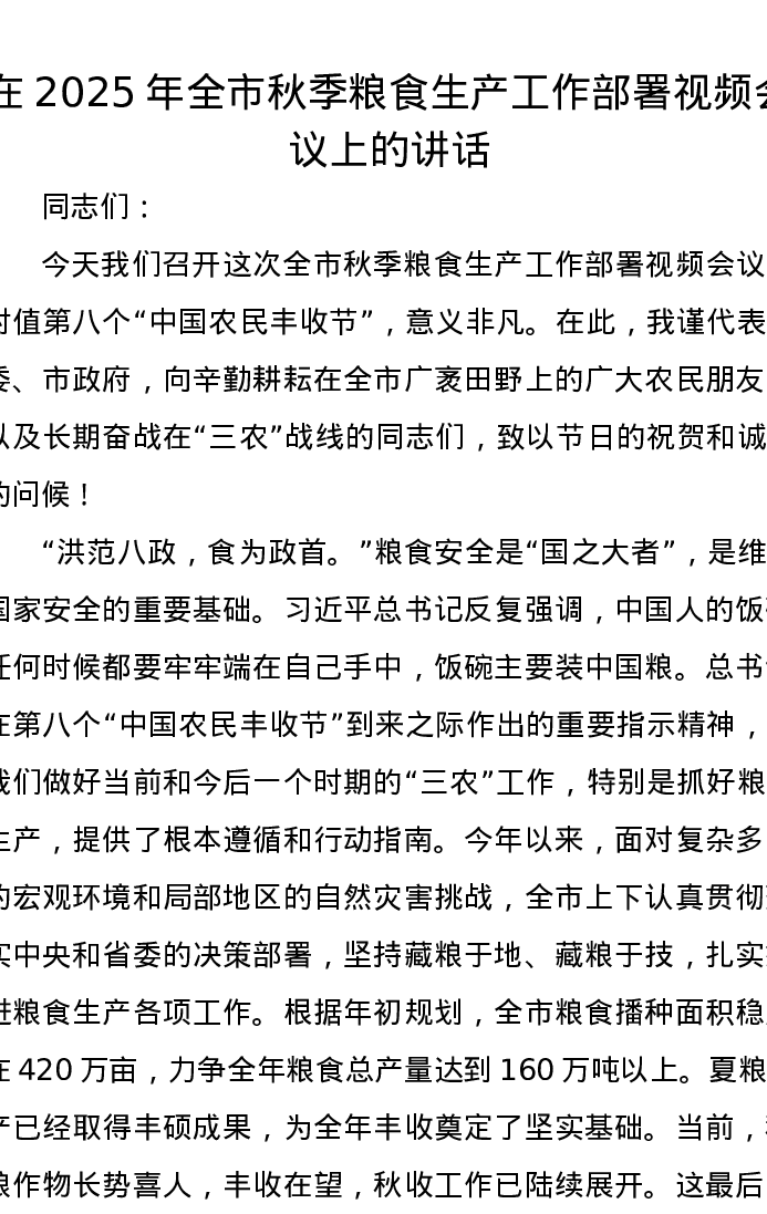在2025年全市秋季粮食生产工作部署视频会议上的讲话