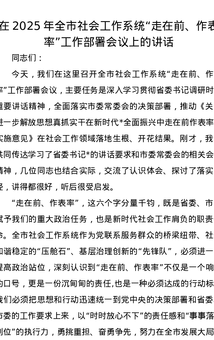 在2025年全市社会工作系统“走在前、作表率”工作部署会议上的讲话