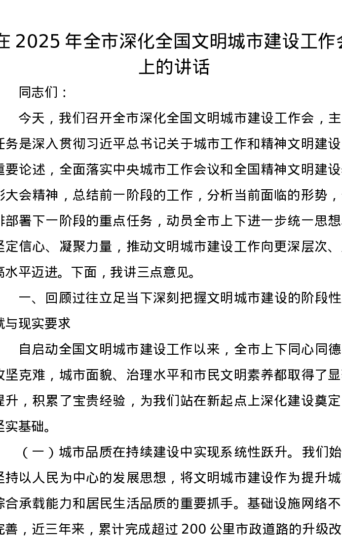 在2025年全市深化全国文明城市建设工作会上的讲话