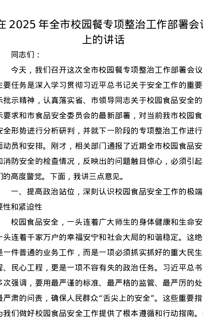 在2025年全市校园餐专项整治工作部署会议上的讲话