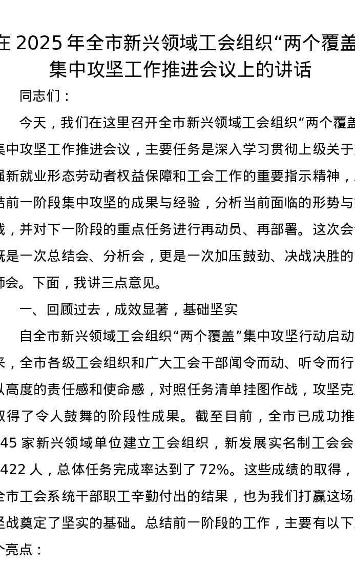 在2025年全市新兴领域工会组织“两个覆盖”集中攻坚工作推进会议上的讲话