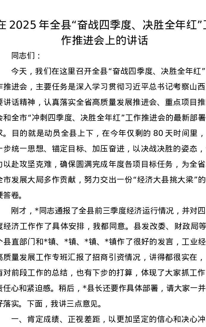 在2025年全县“奋战四季度、决胜全年红”工作推进会上的讲话