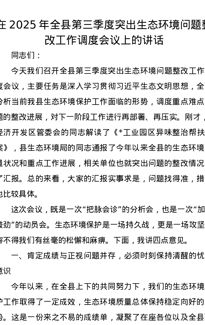 在2025年全县第三季度突出生态环境问题整改工作调度会议上的讲话