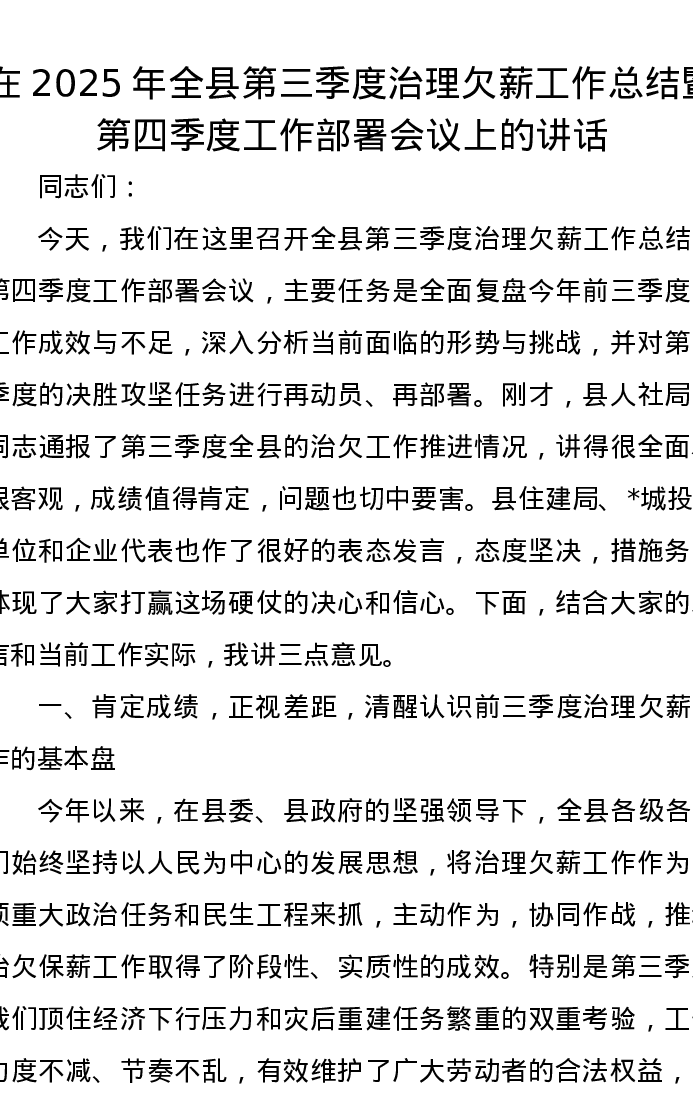 在2025年全县第三季度治理欠薪工作总结暨第四季度工作部署会议上的讲话