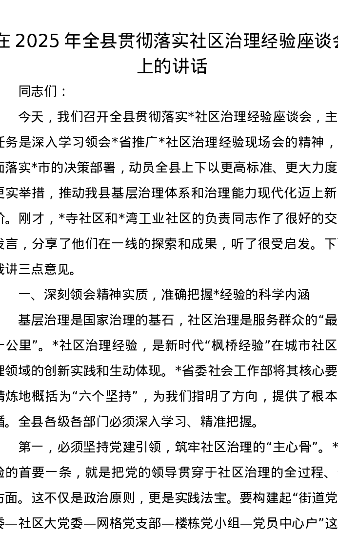 在2025年全县贯彻落实社区治理经验座谈会上的讲话