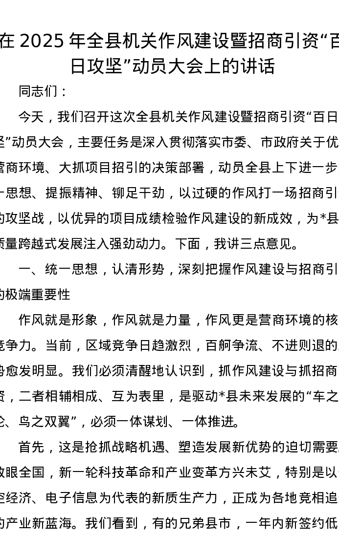 在2025年全县机关作风建设暨招商引资“百日攻坚”动员大会上的讲话