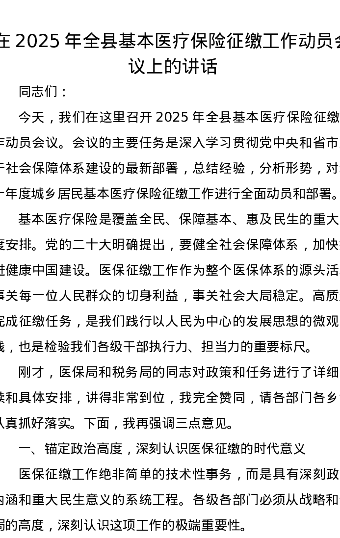 在2025年全县基本医疗保险征缴工作动员会议上的讲话